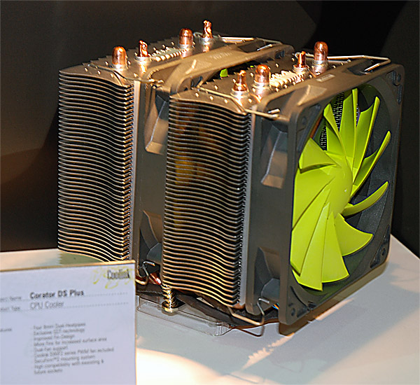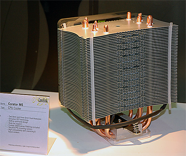 Coolink presenta il Corator DS Plus, evoluzione del precedente Corator DS. Pur essendo in fase di protopio é possibile intravedere le 4 heatpipes da 8mm e due radiatori dotati di 45 alette.