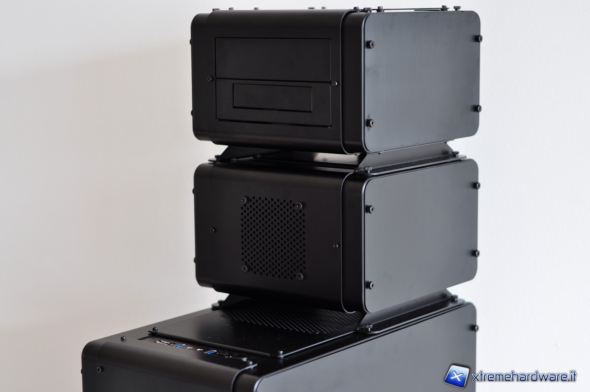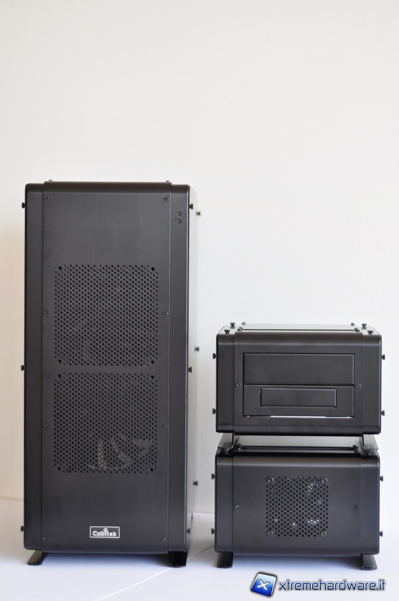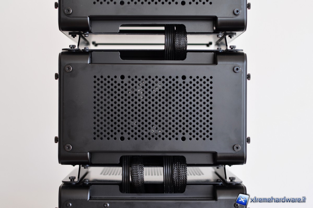 Cubitek ha ben pensato di includere i cavi specifici per consentire un’agevole connessione tra i vari moduli. I cavi da 70 cm per le connessioni SATA (sia di alimentazione sia di trasferimento dati) trovano anche degli spazi appositamente disegnati per il loro passaggio in maniera tale da rendere più pratica la connessione tra i vari moduli. In più i vari moduli presentano dei fori nei piedini e delle thumbscrew sulla paratia superiore in maniera tale da poterli fissare in pila, così da poter assemblare un vero e proprio totem tecnologico. Questi cavi-prolunga sono sleevati al fine di non compromettere l’impatto estetico del sistema. Ovviamente far passare queste prolunghe all’interno dei vari moduli, significherà, per i maniaci del cablaggio, avere dei fastidiosi cavi in disordine e che possono anche dare fastidio alle operazioni di manutenzione dell’hardware. Del resto, un piccolo scotto per ottenere questo grande beneficio della modularità del  sistema lo si deve pur pagare.